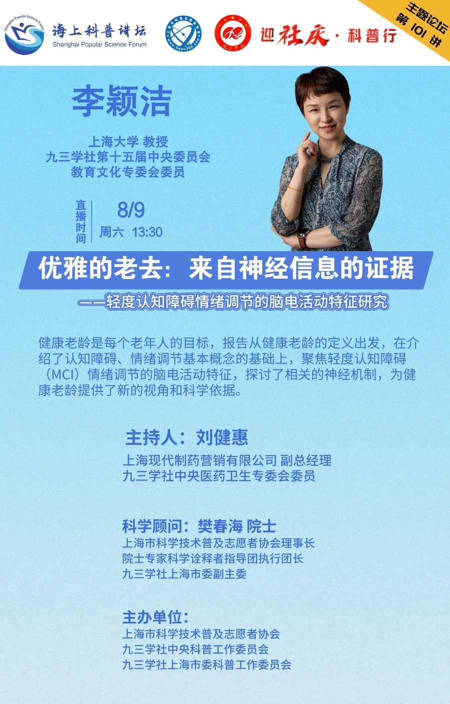 【海上科普讲坛-讲座回放】主题论坛报告会第101讲 李颖洁教授:优雅的老去:来自神经信息的证据——轻度认知障碍情绪调节的脑电活动特征研究